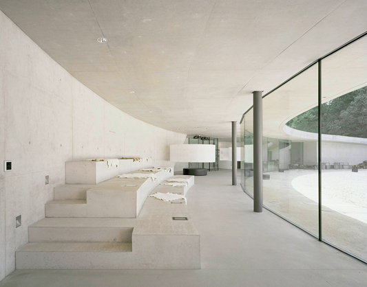 Das Bauwerk ist komplett aus Stahlbeton errichtet und in fast allen Bereichen von außen gedämmt, was aufgrund der Erdauf- und -überschüttung nicht sichtbar ist. Da das knappe Baukosten-Budget keinen Spielraum hinsichtlich besonderer Betonsorten oder teurer Gestaltungsideen bezüglich der Schalhaut zuließ, wurde für seine Herstellung die Standardrezeptur des örtlichen Betonwerkes verwendet. Die Oberflächen waren lediglich in der Sichtbetonklasse SB 2 ausgeschrieben. Um ohne Zusatzkosten eine helle Betonfärbung zu erzielen, erhöhte man den Anteil an Kalkmehl so weit wie möglich.
