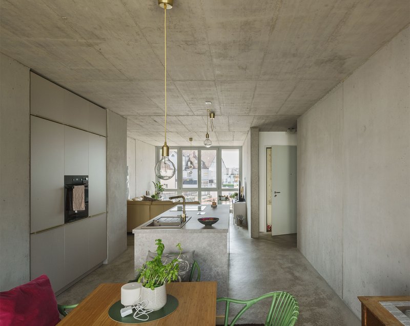 Zu Letzterem trug nicht nur bei, dass keine Makler- und Investorenkosten anfielen, sondern auch die Bauweise. Wie beim Stadthaus und neun weiteren Gebäuden im selben Block hat eine Rohbaufirma auch hier das Skelett Geschoss für Geschoss gefertigt, da alle Häuser möglichst zeitgleich entstehen sollten. Diese Methode hat den Bauablauf enorm vereinfacht und viel Zeit und damit Kosten gespart. Im Fall des „Chamäleon“ – der Name drückt sich auch in der unterschiedlichen Behandlung der Fassaden aus – kam noch Mauerwerk hinzu, und das Treppenhaus in Ortbeton zeichnet sich hinter einer Gussglashülle ab. Alle tragenden Innenwände und die Decken sind aus sichtbar belassenem Beton. Er prägt den Charakter der Räume, trägt aber auch ganz erheblich zum Brand- und Lärmschutz bei. „Außerdem“, fügt David Brodbeck hinzu, „spielte auch hier wieder die Robustheit und damit Langlebigkeit des Materials eine große Rolle.“