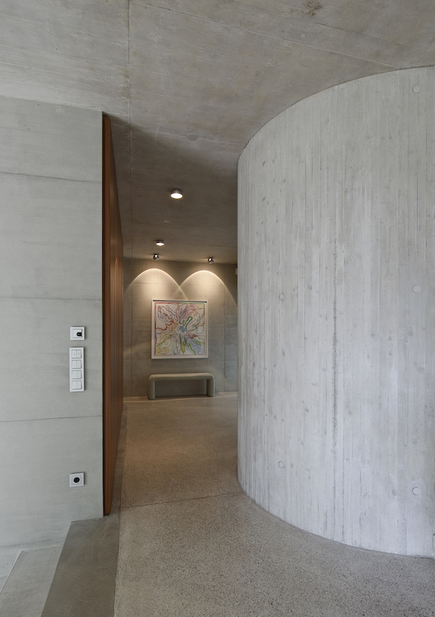 „Es ist ein Haus, das auf diese Weise nur in Stahlbeton möglich ist“, erläutert Architekt Maio das Konzept. Sein Büro realisierte den ingenieurtechnischen Ansatz nicht halbherzig, sondern schuf mit der zweischaligen Betonbauweise mit innenliegender Dämmung ein Bauwerk, das sowohl an der Fassade als auch an den Innenwänden bewusst die authentische Struktur des gegossenen Betons, insbesondere die feine Maserung der gehobelten Schalplatten zeigt. Das Schalungsbild und der Verlauf der Fugen sind kein Zufallsbild, vielmehr bis ins letzte aufeinander abgestimmt. Für die Architekten entscheidend war, die Lage der Ankerlöcher so zu gestalten, dass sie innen wie außen, „also in Bezug zu Innenraum und Fassade, gleichermaßen ein harmonisches Bild ergeben“.