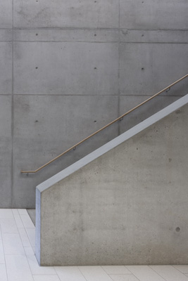 Besonders einfach, pragmatisch und mit einem schönen Ergebnis wurde mit dem Thema der Treppen umgegangen. Ackermann + Raff verzichteten auf teure Sonderkonstruktionen. Sie ließen stattdessen eine konventionelle Konsole betonieren und die Fertigteiltreppe inklusive Podest einfach darauflegen. Eines wollten sie dann aber doch nicht auf Dauer sehen: Die Löcher der Ösen, die normalerweise für die Montage solcher Treppen verwendet werden. Deshalb wurde mit einem Transportband gearbeitet, das man am Ende einfach durchgeschnitten hat. So zeigen dieses Detail und das Gebäude in seiner Gesamtheit, dass pragmatische Lösungen nicht nur im Betonbau zu überzeugenden Ergebnissen führen können.