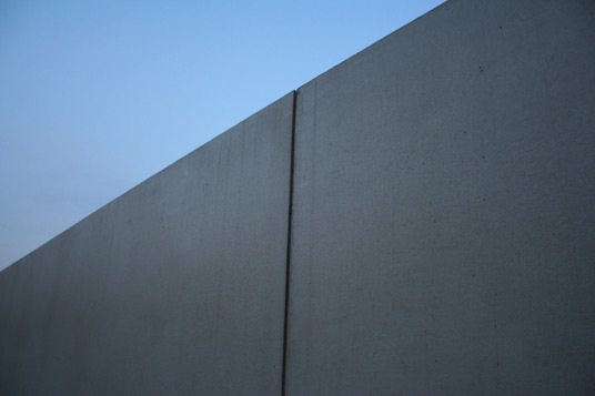Als Material für die Mauern und Wege entschieden sich die Planer für Betonfertigteile aus hellem Portlandzement. Die Mauerscheiben wurden auf großen, flach liegenden Schaltischen gefertigt. Die mit der Schalung verbundene Seite wurde sehr glatt, die offene Seite mit einer besonders feinen Struktur ausgebildet. Anschließend wurden die Oberflächen mit einer Graffiti-Schutzschicht versehen. Die Betonplatten des Weges sind in der gleichen Art ausgeführt, erhielten jedoch eine rutschhemmende Oberflächenstruktur.