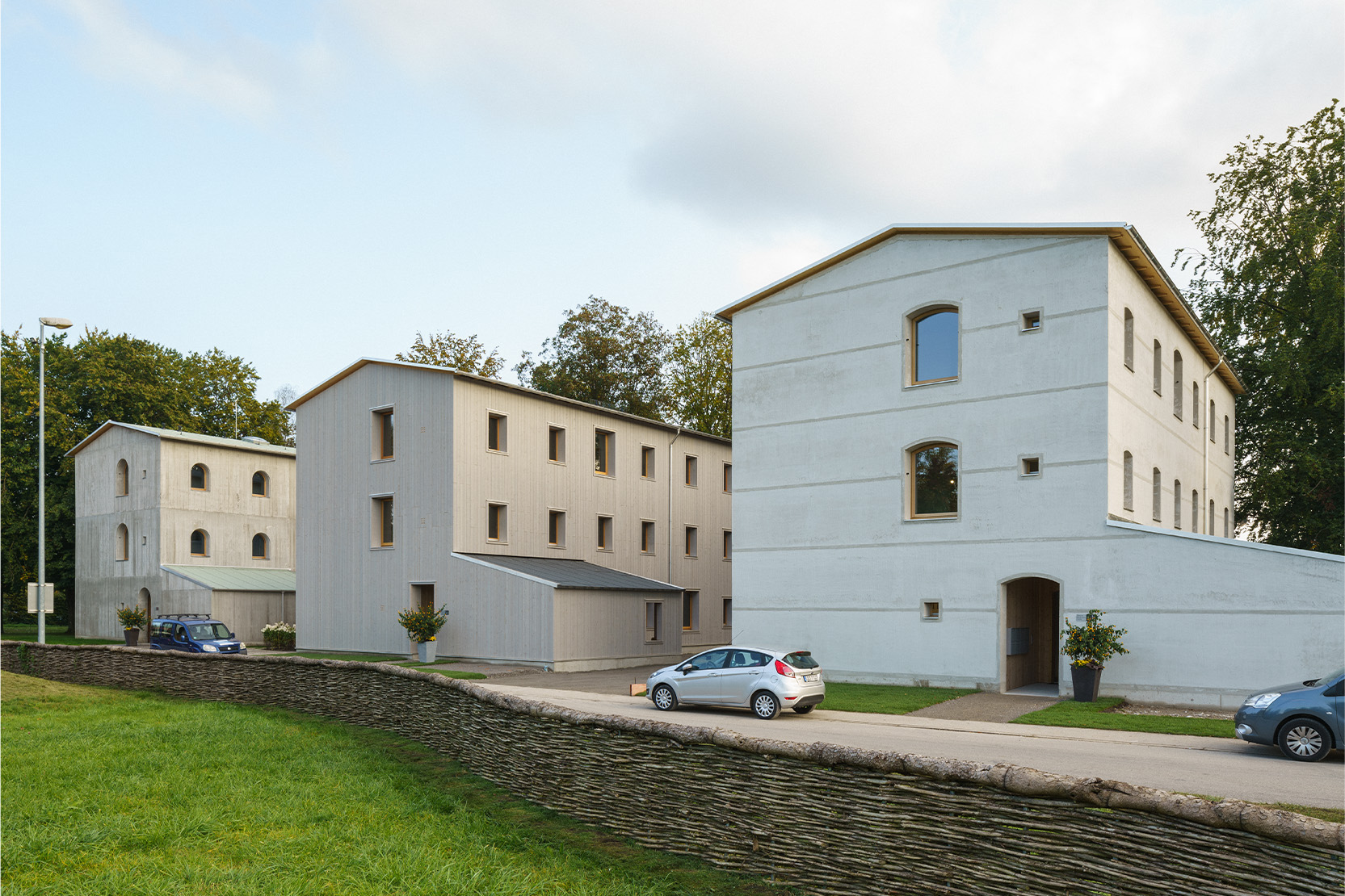 Der Leichtbeton für die 50 cm tiefe Außenwand wurde mit porösen Zuschlagstoffen versehen und besitzt alle notwendigen wärmedämmende Eigenschaften. Die Konstruktion kommt dabei ohne Ankerlöcher, Dehnungsfugen oder Dreikantleisten für die Betonierabschnitte aus. Der Beton wurde betont ruppig mit Schlieren, Verfärbungen und rauen Oberflächen ausgeführt.