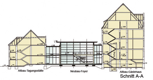 Die beiden Gebäude werden durch den Neubau des 2-geschossigen Foyers miteinander verbunden. Gleichzeitig wird dadurch der "öffentliche" Eingangsbereich vom eher "halböffentlichen" Terrassenbereich auf der Rückseite getrennt. Erst dadurch entstehen beiderseits des Foyers geschützte Innenhofbereiche durch jeweils 3 "Platzwände".