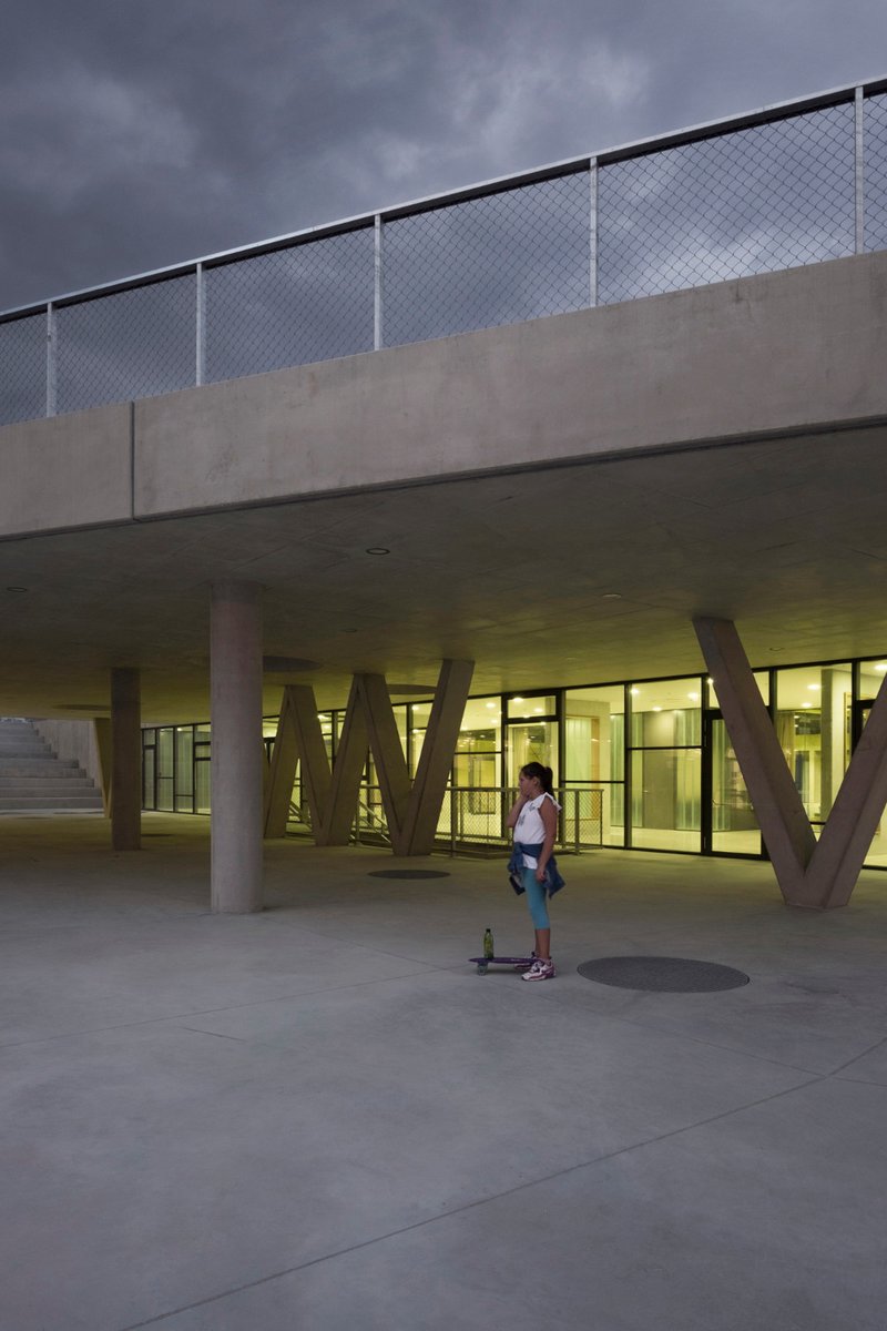 Das Erdgeschoss erschließt eine Plattform, die als Eingangshof gestaltet ist und auf die von der Straße aus eine leicht geneigte Rampe führt. Auf den Schuleingang steuert man von dort aus direkt zu, rechterhand liegt der Zugang zur Turnhalle. Eine große Aula mit Gemeinschaftsflächen verbindet die unterschiedlichen Bereiche im Erdgeschoss und schafft weitere Zonen, die der Verwaltung, der Bibliothek, dem Turnen oder der Erholung dienen. Die Unterrichtsräume sind zweckmäßig gestaltet und auf die Bedürfnisse der jeweiligen Jahrgangsstufen ausgerichtet.