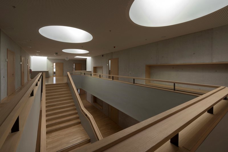 Im Zusammenspiel mit verzinkten Stahlprofilen und Maschendrahtfüllungen sowie Details wie den dunkel gerahmten, vielteiligen Fenstern wirkt das Material stimmig, gerade weil es nicht den höchsten Sichtbetonanforderungen genügt. In den Klassentrakten wurden Böden, Treppen und Türen in Holz ausgeführt, was diesen Aufenthaltsräumen die Rohheit nimmt und eine behagliche Atmosphäre schafft.