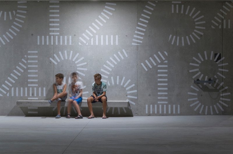 Um die Fassade vor Verunstaltung zu schützen und in ihrer Ausdruckskraft zu stärken, wurde der Grafikdesigner Nikola Đurek mit der Gestaltung beauftragt. Für das Gebäude der Eingangs- und Grundstufe wählte er Buchstaben, für den Trakt mit den Klassenräumen der Unter- und Mittelstufe Zahlen. Kurze weiße Striche formen die Zeichen, die sich auf dem Sichtbeton zu scheinbar unendlichen Reihen fügen. Aufgebracht wurde die Typografie mithilfe von Folien, bei denen die formgebenden Striche schablonenartig ausgestanzt waren. Nach dem Trocknen der Farbe konnten die Folien entfernt werden. -chi