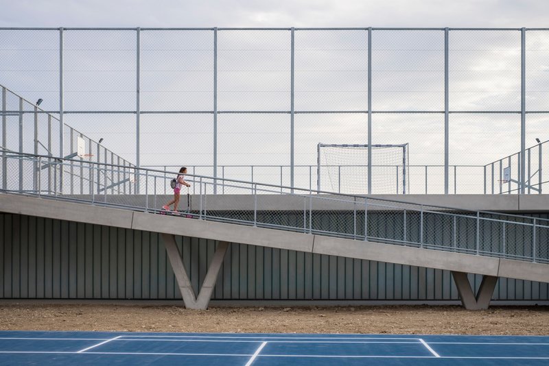 Sehnsüchtig erwartet wurde die neue Schule von den Anwohnenden in einem Stadtrandgebiet von Split. Bietet sie doch nicht nur angemessene Unterrichtsräume für 720 Kinder, sondern auch öffentlich zugängliche Sportflächen und Treffpunkte für die Nachbarschaft. Bisher prägten die zersiedelte Gegend neben Wohnhäusern vor allem ein großer Supermarkt, einige Gewächshäuser und Werkstätten. Wie ein Mahnmal ragt darüber der Rohbau eines gescheiterten Investorenprojekts hinaus.