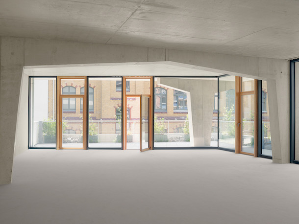 Die unter Denkmalschutz stehende Backsteinfassade des Vorderhauses bildet die Basis, über welcher der Neubau aufragt. Seine klare Struktur wird durch eingesprengte Grüninseln immer wieder aufgebrochen, was seine skulpturalen Bauteile eher betont. Die Architekten sahen die Verbindung zum ehemaligen Telegraphenbauamt durchaus augenzwinkernd: „Um dem Bestandsgebäude ein würdiges Gegenüber zu geben, mit vergleichbarer Materialqualität, wurde der Neubau als Ruine konzipiert, die von der Natur zurückerobert wird.“ Tatsächlich dachten sie entlang dieser Maxime alles Neue von vornherein ziemlich „roh“, sodass die Kontraste aus historischem Fassadenfragment und Neubau mit seiner schlichten Betonfassade, großzügigen Glasfronten und üppigem Grün ein größeres Bild ergeben – eine Einheit. Dazu zollten sie dem Bestand Respekt und arbeiteten die verbliebenen Fenstergitter, Kastenfenster und Brüstungen, historischen Treppengeländer und Ziegelkappendecken sorgfältig auf. Hinzugefügt wurde nur, was wirklich nötig war: Im Altbau entfiel beispielsweise eine Lüftungsanlage, da die Architekten nachweisen konnten, dass die freie Lüftung ausreicht. „Dem Denkmal seine Geschichte lassen“, lautete die Devise, nach der auch der Neubau umso selbstverständlicher auftreten konnte.