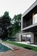 Die Villa mit Flachdach ist im Erdgeschoss lang gestreckt und schmal. Ein schräg eingestelltes Volumen sowie das über dem Eingang auskragende, verkürzte Obergeschoss gliedern den Baukörper. Gen Norden zeigt dieser sich weitgehend geschlossen – nur wenige hohe Schlitze durchbrechen hier die Außenwände. Zum See im Südwesten öffnet sich die Fassade mit geschosshohen Verglasungen, die teilweise leicht zurückgesetzt sind. Anthrazitfarbener Beton und Eichenholzrahmen für Fenster und Türen prägen die äußere Erscheinung.