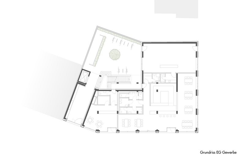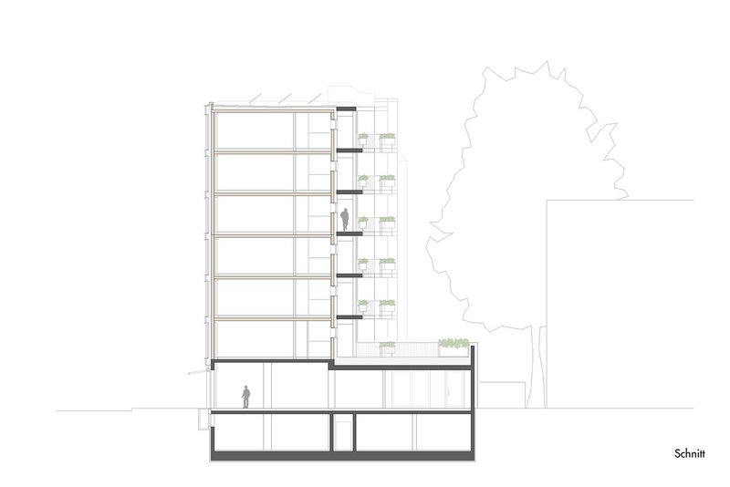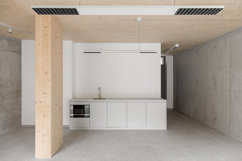Zunächst einmal tritt die Holzfassade ab dem ersten Obergeschoss in Erscheinung. Es handelt sich bei diesem Haus aber um einen Holz-Beton-Hybridbau. Diese „Mischwesen“ entstehen in den letzten Jahren gehäuft, um die Vorzüge beider Materialien zu nutzen – da ist der nachwachsende und vergleichsweise leichte Baustoff auf der einen und der tragfähige, Brand- und Schallschutzanforderungen bedienende, frei formbare Beton auf der anderen Seite. „Ganz wichtig ist eine frühzeitige Klärung der Schnittstelle zwischen Massiv- und Holzbau,“ betont Rolf Mattmüller, der das „M“ im Büronamen beisteuert. So auch hier: Der Keller und das Erdgeschoss bestehen aus Stahlbeton und bilden den robusten Sockel des hölzernen Aufbaus. Auch die Innenwände im ersten Stockwerk bestehen aus Beton. Es bleibt aber nicht allein bei den statischen Erwägungen. Die Gewerbe- und die Büroräume sind durch die Sichtbetonwände charakterisiert, was sich mit den hölzernen Decken sehr gut verträgt. Auf der Hofseite ist dem eigentlichen Gebäude regalartig die Laubengangerschließung mit den offenen Treppen vorgesetzt. Sie besteht wie der Aufzugsschacht aus vorgefertigten Betonteilen. Das setzt den schönen Materialmix fort und erledigt außerdem die Anforderungen an den Brandschutz. So wie der Hof mit einem urban gardening-Angebot gemeinschaftlich genutzt werden kann, steht auch die Dachterrasse auf dem eingeschossig weitergezogenen Betonsockel allen im Haus zur Verfügung.