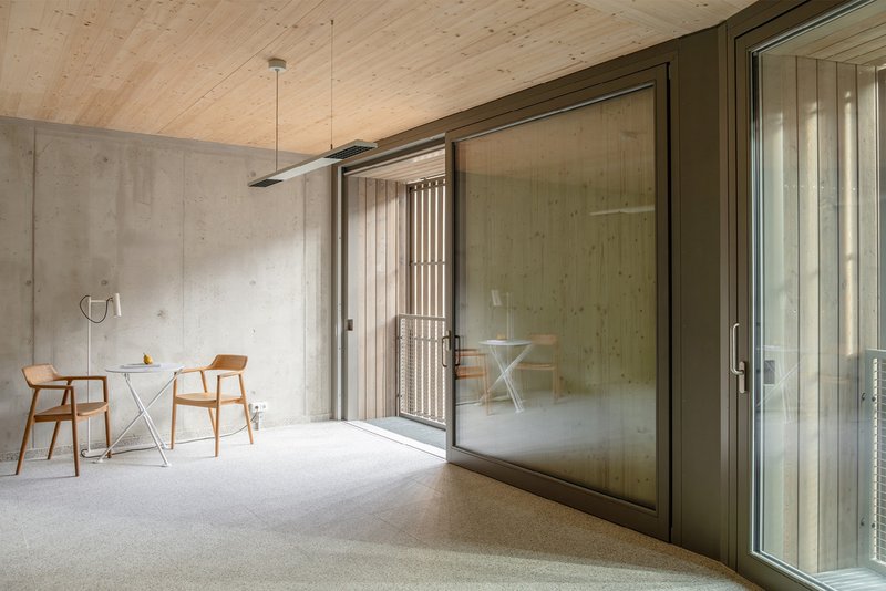 Die Glasschiebetüren lassen sich vollständig hinter die Holzfassade verschieben. Dadurch kann sich das Apartment großzügig wie eine Loggia zur Stadt öffnen.