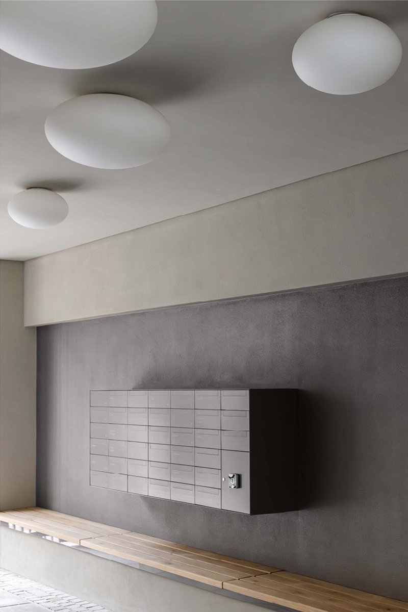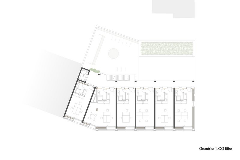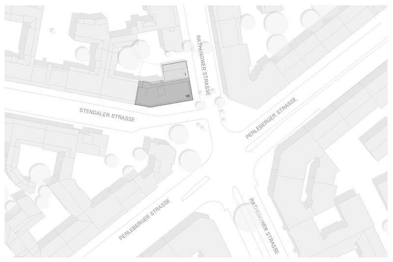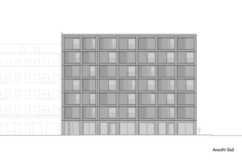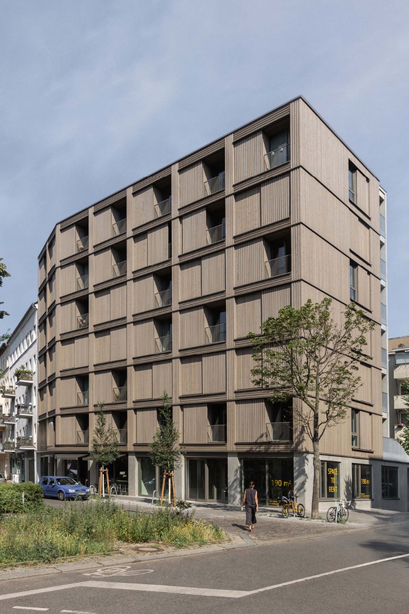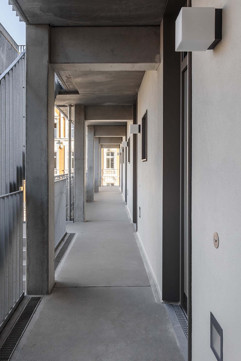 Der Neubau steht leicht abgesetzt von einer großen Kreuzung auf einem Eckgrundstück, wo zuvor in einem Flachbau ein Supermarkt beherbergt war. Das siebengeschossige Haus tut der Ecke städtebaulich gut, weil es mit einem kleinen Knick den Blockrand auffüllt. Ihn jedoch nicht ganz abschließt; ein Durchgang zum Hof mit alten Bäumen, E-Ladestation und Fahrradständern bleibt frei. Von hier werden über Laubengänge alle Wohnungen in den fünf Obergeschossen erschlossen. Im ersten Stock liegen sechs Büros. Im Erdgeschoss ergänzen drei Gewerbeeinheiten den Nutzungsmix – hier sind bereits ein Café und ein Yoga-Studio eingezogen.