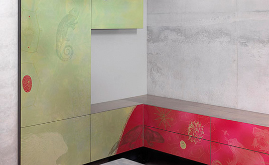 Die Möblierung der Praxis greift die Idee des Mäanders auf. Schränke, Regale und projektierte Bemalungen und Bedruckungen durchdringen die Geschosse gleichsam in einer zweiten Aufwärtsbewegung. Details der Geländer und der rückseitigen Fassade verwenden Motive ähnlicher Knickungen, die auch als vegetabiles Muster gesehen werden können. In den Materialien – Sichtbeton, Räuchereiche, Ahorn, schwarzes Eisen, Filz – sind einfache und sinnliche Assoziationen zum Körperbau möglich, die eine unaufdringliche und warmtonige, gleichwohl ernste und stimulierende Atmosphäre schaffen sollen.