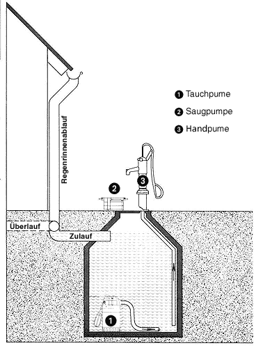 Die Zisterne wird in Hausnähe im Erboden versenkt und mit einem begehbaren Schachtdeckel versehen. Der vom Dach abfließende Regen gelangt über die Dachrinne zu einem Vorfilter und weiter in die eigentliche Zisterne. Modernste Anlagentechnik mit weiteren Reinigungsverfahren, Pumpen und Leitungen bringen das Regenwasser schließlich in das Gebäude zu einer Hauswasserstation, die es weiter an die Toiletten, Waschmaschine und Wasserhähne für Putzwasser im Haus verteilt. Das normale Trinkwasser, das zum Kochen, Baden, Duschen und Spülen verwendet wird, ist vom Regenwassersystem getrennt.