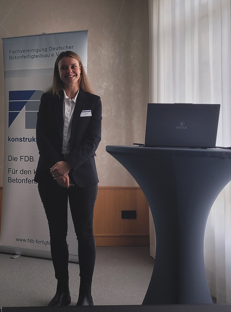 Zum ersten Mal präsentierte sich Saskia Stalberg als neue Kollegin im FDB-Team den Mitgliedern. Sie ist seit dem 1. April 2025 die Neue. Frau Stalberg wird als technische Referentin in den Bereichen Betontechnologie, Innovation und Nachhaltigkeit ihr Fachwissen in die FDB einbringen. In Ihrem Studium des Bauingenieurwesens, Fachrichtung Baubetrieb an der TH Köln schrieb sie ihre Masterarbeit über das Thema „Ökonomische und ökologische Betrachtung des 3D-Betondrucks im Vergleich zu konventionellen Betonbauweisen“. Zuvor absolvierte sie ein duales Bachelorstudium beim Bau- und Liegenschaftsbetrieb NRW und war dort in der Projektsteuerung und Bauleitung tätig. Frau Stalberg trug im Geschäftsbericht zur FDB-Mitgliederversammlung das Thema „Fachbereichserweiterung: Betontechnologie“ unter anderem zu „Umweltproduktdeklarationen im Betonfertigteilbau“ und „Baustoff Beton in der Gremienarbeit“, vor. Die FDB freut sich sehr über den Zuwachs ihres Teams und weiß schon jetzt, dass damit der Weg für noch mehr fachliche Verbandsarbeit geebnet ist.