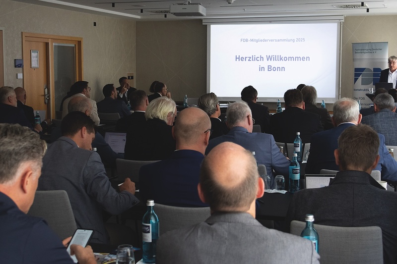 Die Fachvereinigung Deutscher Betonfertigteilbau e.V. (FDB) lud am 26. September 2025 zu ihrer jährlichen Mitgliederversammlung ein – diesmal nach Bonn am Rhein, der Heimatstadt der FDB. Der Vorsitzende Christian Drössler führte durch die Sitzung. Nach der Eröffnung der Versammlung trugen die Geschäftsführerin Elisabeth Hierlein, der technische Geschäftsführer Mathias Tillmann sowie die Projektleiterin Alice Becke und die technische Referentin Saskia Stalberg den Geschäftsbericht vor und brachten damit die Mitglieder auf den aktuellen Stand der Fach- und Öffentlichkeitsarbeit im letzten Jahr.