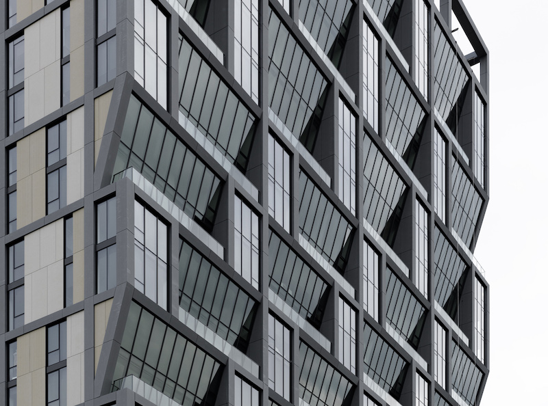 Eine wichtige Rolle für das harmonische Verhältnis des attraktiven Wohnhochhauses zu seiner Umgebung spielt die Fassadenverkleidung aus concrete skin von Rieder. Über 4000 Quadratmeter der nur 13 Millimeter dünnen Platten aus nicht brennbarem Glasfaserbeton umhüllen die Konstruktion aus vorgespanntem Stahlbeton. Die Textur und Farbigkeit der aus mineralischen Rohstoffen bestehenden Paneele sorgen für einen ästhetischen Einklang mit dem Charakter des von Sandstein- und Ziegeltönen geprägten Stadtteils. Der dunkle Farbton liquid black betont das Muskulöse der Struktur, sanftes Beige von sandstone und sahara, das gut mit dem hohen Anteil an Holzoberflächen im Inneren korrespondiert, für wohnliche Wärme.