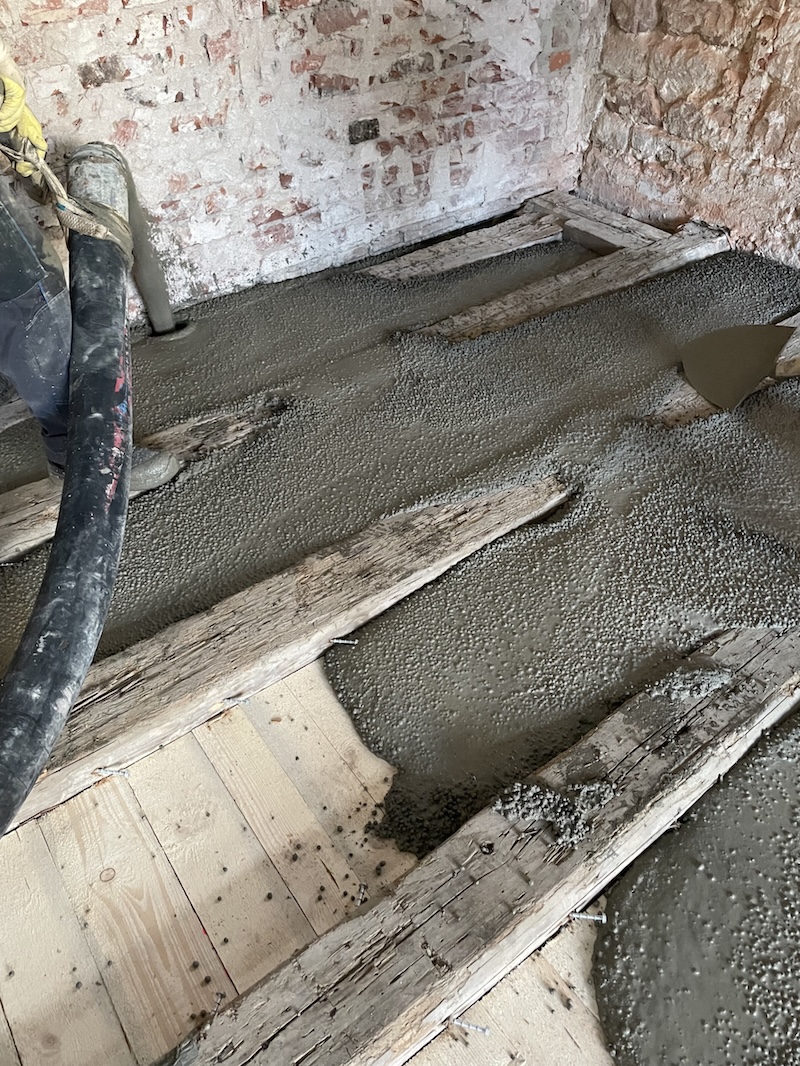 Die praktische Umsetzung demonstriert die Praxisvorteile: Im Juli 2024 wurden 12 Kubikmeter Liapor-Leichtbeton mittels Betonpumpe in den ersten Stock befördert und über eine 25 Meter lange Gummischlauchleitung präzise zwischen den historischen Balken eingebracht. Michael Weber von der ausführenden Projektbau Matthias Regner GmbH beschreibt die Arbeiten: „Hingepumpt, verteilt, mit der Rüttelflasche verdichtet und abgezogen – und zwar auf den halben Zentimeter genau. Jedes Balkenfeld erhielt seine individuell abgestimmte Höhe.“ Spezielle Schubverbinder in den Balken gewährleisteten einen kraftschlüssigen Verbund und verhinderten Risse an den Kontaktstellen zum historischen Holz. Den oberen Abschluss bildet ein Trockenestrich, der das historische Tragwerk zusätzlich schützt und stärkt.