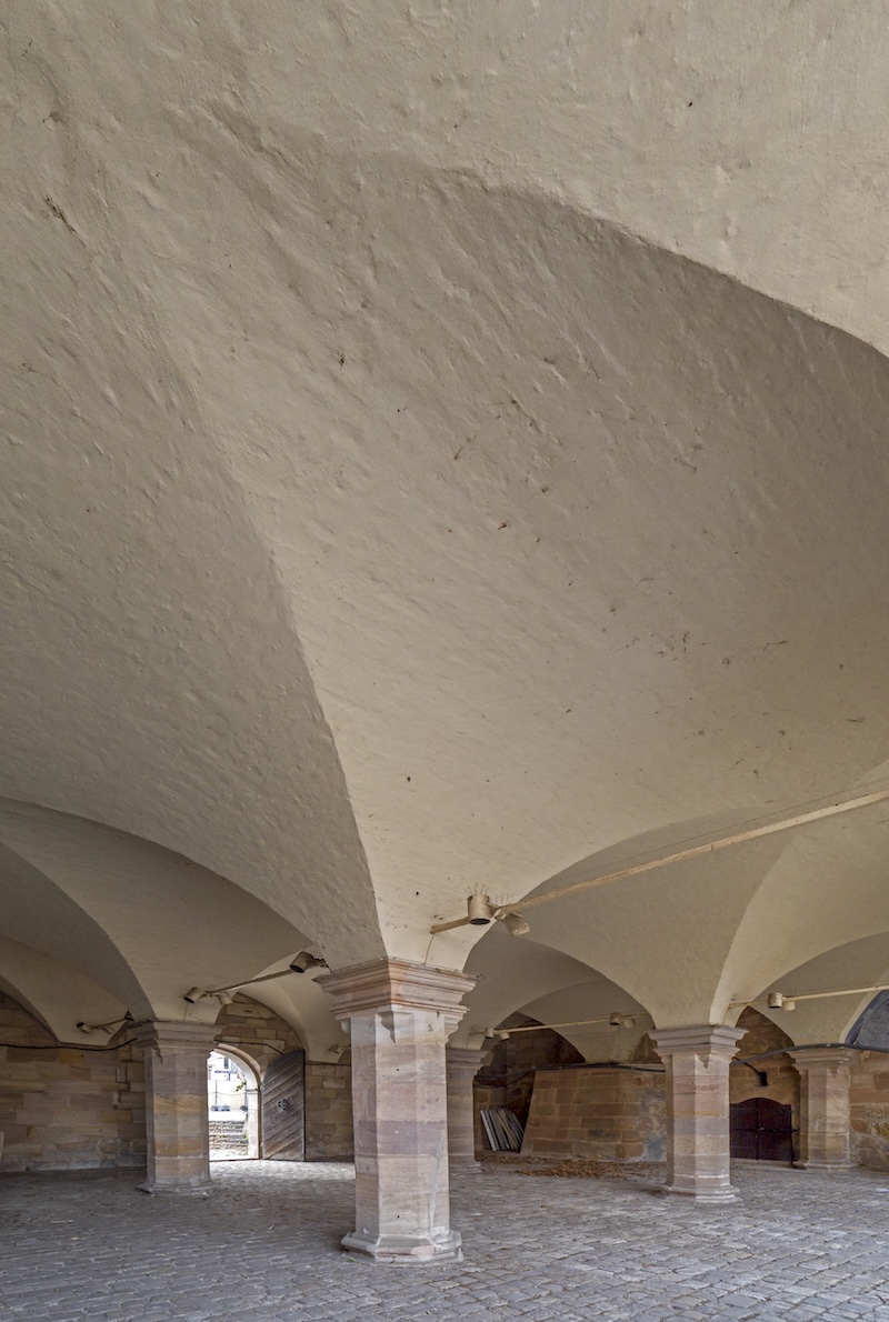 Über dem Kreuzgewölbe der Säulenhalle erreichte der Leichtbeton eine Gewichtsersparnis von 7,2 Tonnen bei 9 Kubikmeter verbautem Material. Die Trockenrohdichte von Liapor-Leichtbeton mit 1,6 t/m³ statt 2,4 t/m³ bei Normalbeton entlastete die historische Bausubstanz signifikant. Panagiotis Leontiou von der CEMEX Deutschland AG, die den Liapor-Leichtbeton herstellte und lieferte, erklärt die Besonderheit der Verarbeitung: „Um Verstopfungen in der Schlauchleitung zu vermeiden, wurde der Blähton vorgenässt. Das verhinderte, dass die Liapor-Gesteinskörnung während des Pumpvorgangs Wasser aus der Betonmatrix entzieht und die Konsistenz dadurch zu steif wird.“ Dies sicherte die problemlose Verarbeitung des Liapor-Leichtbetons, auf dem Gussasphalt als abschließende Verschleißschicht folgt.