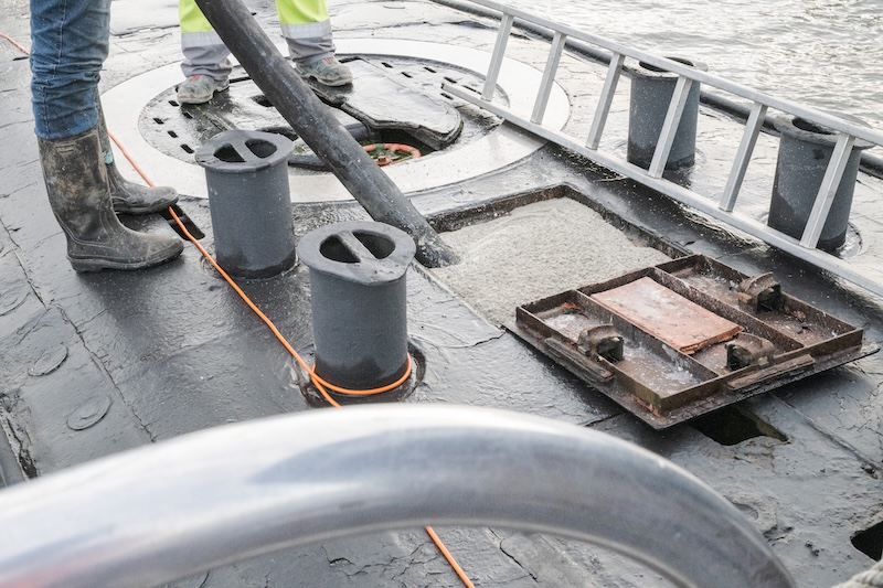 „Die Heidelberg Materials AG hat uns bereits beim Bau des Besucherzentrums mit dem Beton für die Bodenplatte beliefert und spielt seitdem beim Erhalt des U-Boots eine entscheidende Rolle“, erklärt Christian Angermann. Denn um ein ungewolltes Auftauchen von U-434 bei Sturmfluten zu verhindern, gaben die Behörden vor, das Boot mit zusätzlichen 500 Tonnen Ballast zu sichern. Christian Angermann setzte dazu auf den Unterwasserbeton von Heidelberg Materials, der das Boot optimal ballastiert. Zudem schützt der Unterwasserbeton das U-Boot auch langfristig vor Verfall. „Diese Maßnahme ist notwendig, weil bei jeder Tide über die Austrittsöffnungen Luft in die Tauchtanks eindringt. Der ständige Wechsel zwischen Luft und Wasser führt zu Korrosion und könnte auf Dauer die Struktur des Bootes gefährden. Dazu wurde die Betonmischung durch temporär installierte Stutzen, die an den Luftaustritten aufgespannt sind, eingepresst. Der Beton wird in die Ballasttanks des U-Boots mit Hilfe einer 50-Meter-Betonpumpe eingebracht und ersetzt dort das vorhandene Wasser“, erklärt Benjamin Zimmermann von der Heidelberg Materials Beton, Region Nord-West. Diese Arbeit erfordert höchste Präzision, denn es dürfen keine Wassernester zurückbleiben. Diese könnten im Winter gefrieren und durch die Ausdehnung zu schwerwiegenden Schäden führen. Daher wurde das Einpressen mit äußerster Sorgfalt durch erfahrene Betonpumpenmaschinisten von Heidelberg Materials durchgeführt. „Beton gammelt nicht und rostet nicht – er schützt, stabilisiert und hält. Dank seiner alkalischen Umgebung zwischen pH 11 und 13 bleibt der Stahl sicher eingebettet und vor Korrosion bewahrt. Mit seiner fließfähigen Konsistenz und hoher Pumpfähigkeit lässt sich der Unterwasserbeton mühelos einbauen – ganz ohne zusätzliche Verdichtung“, ergänzt Andreas Kannenberg, Betontechnologe bei Heidelberg Materials Beton, Region Nord-West.